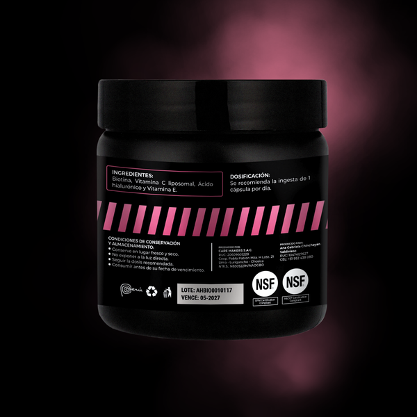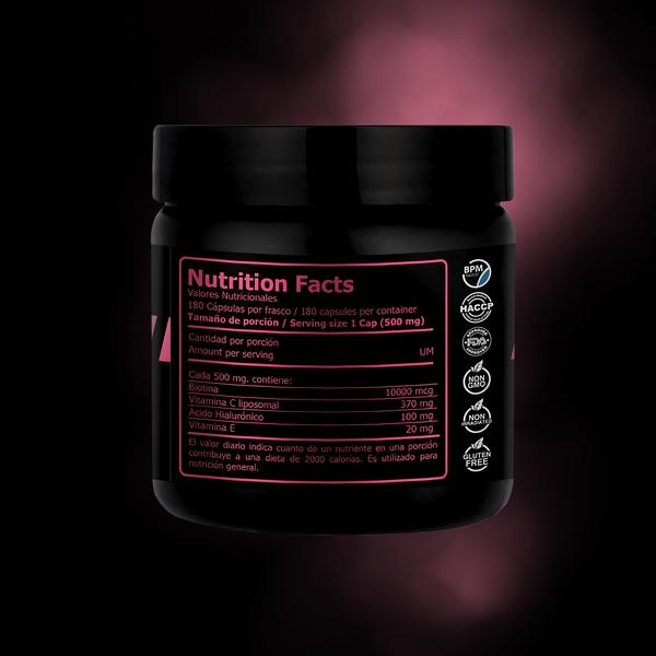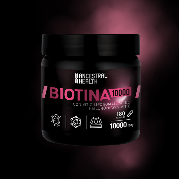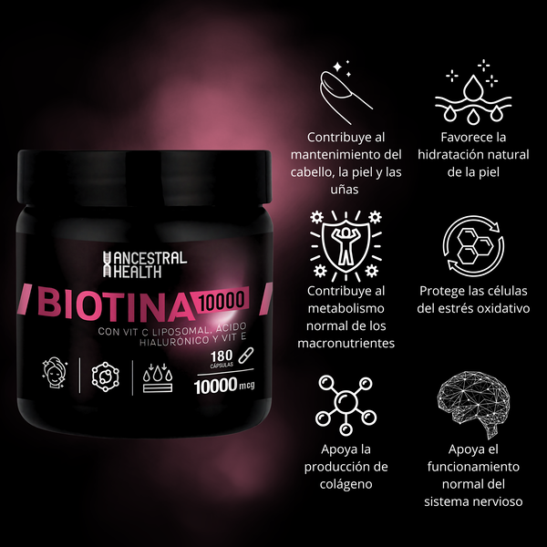 Nuestra Biotina 10000 con Vitamina C Liposomal, Ácido Hialurónico y Vitamina E está diseñada para apoyar el cuidado integral de tu piel, cabello y uñas.
