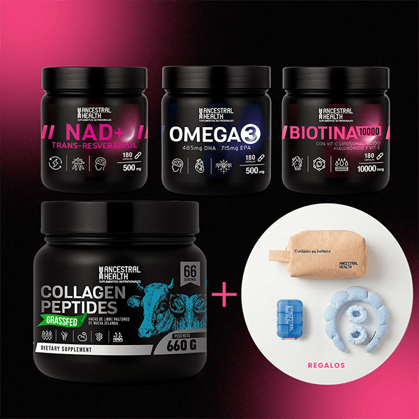El Pack Día de la Madre de Ancestral Health combina Péptidos de Colágeno, NAD+, Biotina y Omega 3 para acompañar el cuidado integral del cuerpo, la vitalidad y la belleza en el día a día. Además, incluye regalos especiales pensados para complementar su rutina de autocuidado.