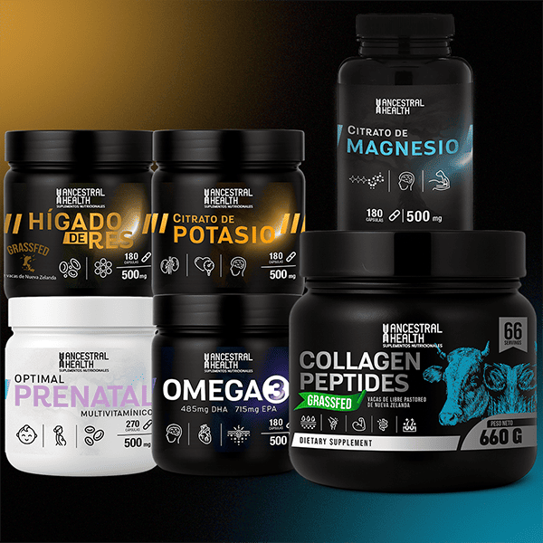 El Pack Postparto y Lactancia combina Péptidos de colágeno, Citrato de magnesio, Citrato de potasio, Prenatal, Hígado de res y Omega 3 para acompañar la recuperación materna y apoyar las mayores demandas nutricionales de esta etapa.