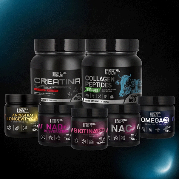 El Pack Rejuvenece PRO potencia tu bienestar desde adentro con una fórmula integral de Creatina, NAD+, Biotina, Colágeno, NAC, Omega 3 y Longevity, diseñada para quienes buscan mantener un cuerpo activo, una mente clara y una apariencia rejuvenecida.