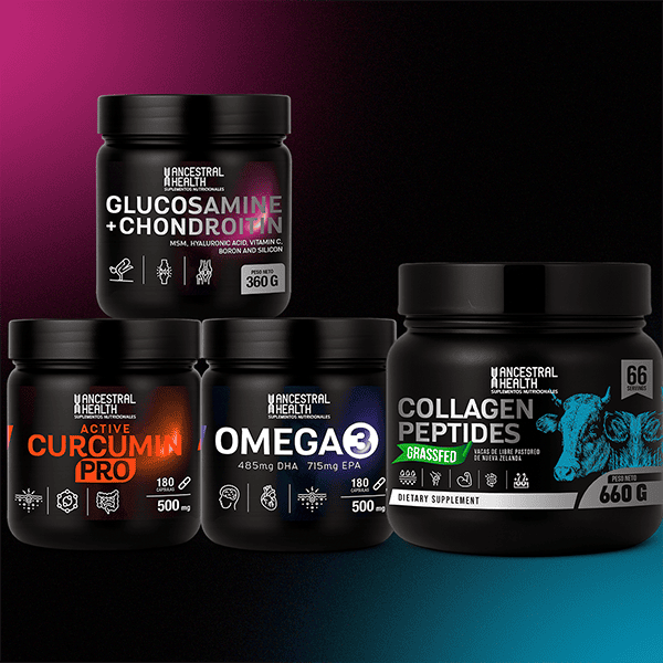 El Pack Rodilla combina colágeno, glucosamina, curcumin y Omega 3 para acompañar el cuidado de la rodilla y apoyar su función en el movimiento diario.